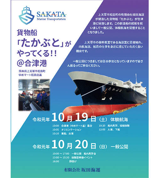 就航前に地元の中学生を招待して、乗船体験をとおして貨物船の仕事を体感できる機会を設けました。また翌日には一般公開と称して船内を解放し、地元または熊本県内外から